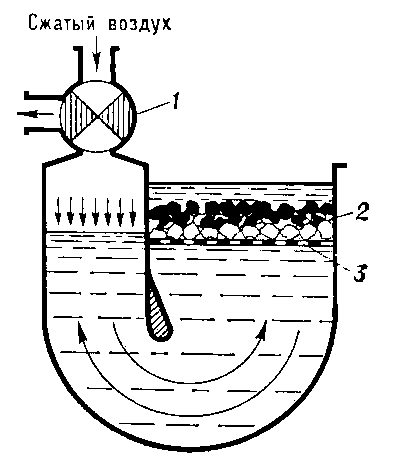 Принципиальная схема отсадки: 1 — пульсатор; 2 — отсадочная постель; 3 — решето.