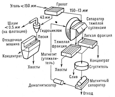 Рис. 1 Принципиальная схема гравитационного обогащения угля отсадкой из тяжёлой суспензии.