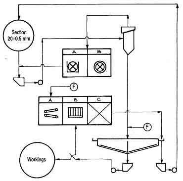 Рис.1.представляет обезвоживание концентрата на вакуумных фильтрах или пресс фильтрах, так же как обезвоживание отходов на на ленточном фильтр- прессе. Выбор между вакуумными фильтрами и пресс-фильтрами зависит от требуемой влажности смеси из концентрата 20-0,5мм и 0,5-0мм.