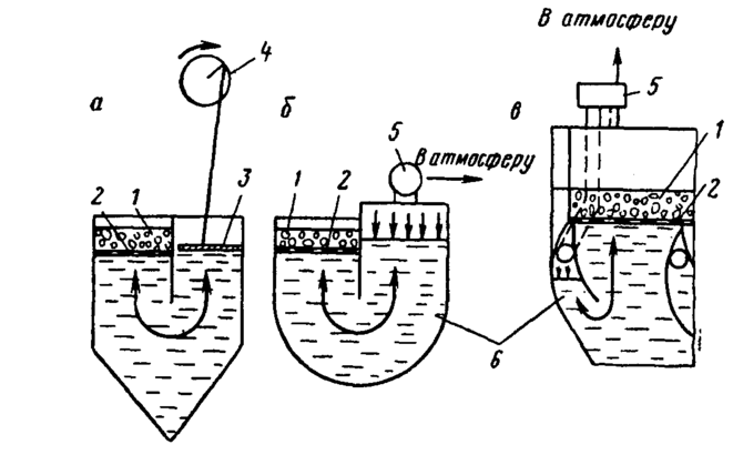 Схема осадочных машин: 1 – постель; 2 – решето; 3 – поршень; 4 – кривошипно-шатунный механизм; 5 – пульсатор; 6 – подрешетная вода