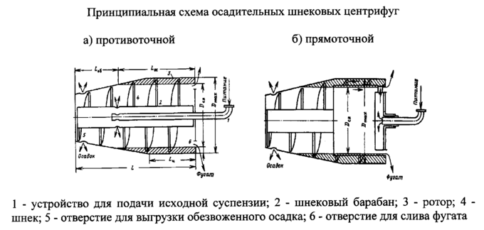 Осадительное центрифугирование осуществляется в центрифугах со сплошным ротором. Суспензия под действием центробежных сил прижимается к внутренней поверхности ротора. Твердые частицы, обладающие большей плотностью, осаждаются в объеме суспензии и концентрируются у стенок ротора, вытесняя воду в пространство, расположенное ближе к центру вращения. Фугат удаляется из ротора через сливные окна, а осадок транспортируется шнеком к разгрузочным патрубкам. Таким образом, общие закономерности центрифугирования во многом аналогичны закономерностям фильтрования и осаждения в поле гравитационных сил.