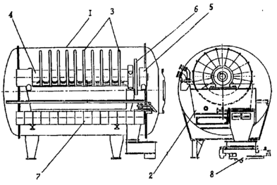 1 – сосуд под давлением; 2 – ванна фильтра; 3 – диски; 4 – ячейковый вал; 5 – распределительная головка; 6 – привод дисков; 7 – транспортер; 8 – разгрузочное устройство