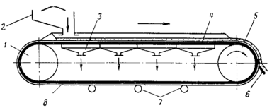 1 – натяжной барабан; 2 – загрузочный лоток; 3 – вакуум-камера; 4 – лента;