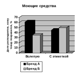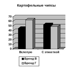 В. Перция для доказательства существования брендов и их эффективности приводит результаты одного эксперимента. Суть опыта проста. Группе испытуемых предлагают попробовать применить товары (моющие средства и картофельные чипсы) первый раз в таком виде, что их невозможно опознать, второй раз – в их «родной» упаковке. Люди должны были в обоих случаях выбрать те продукты, котрые лучше: в первом случае – стирают грязные вещи, во втором – на вкус. На рисунке 1 графически изображены результаты такого эксперимента.