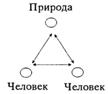 Обмен человека и природы имеет линейное развитие до возникновения обмена между людьми. Возникновение обмена человек - человек и дальнейшее становление экономических взаимоотношений придает обмену еще одно важное направление развития. С этого момента обмен, а вместе с ним и маркетинг, приобретают двунаправленное развитие. Человек становится участником как обмена человек - человек, так и обмена человек - природа. При внимательном рассмотрении становится ясно, что оба обмена основываются на использовании природных ресурсов: для обмена человек -природа это очевидно, но и в обмене человек – человек в той или иной форме участвуют природные материалы, т. е. оба обмена замыкаются на природу. Таким образом, возникает треугольник обмена человек - природа – человек (рис. 1).