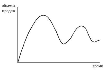 Хотя представленная кривая жизненного цикла товара типична, она не всегда имеет такой вид. Одним из часто встречающихся вариантов является кривая «с повторным циклом» (рис.2). Второй «горб» сбыта вызывается мероприятиями по стимулированию сбыта, проведенными на этапе упадка товара.