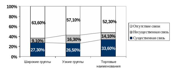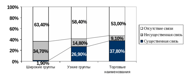 Расчеты корреляционных коэффициентов показали, что в целом для всего ОТС- рынка корреляция между рекламными выходами и объемом продаж носит несущественный характер, а при различных подходах к сегментации рынка значимая корреляционная связь обнаруживается не более чем у трети всех структурных элементов анализа. В то же время прослеживается тенденция увеличения числа корреляционных связей между рекламой и продажами по мере углубления сегментации. Так, если из числа фармакотерапевтических групп тесные корреляционные связи наблюдаются примерно у 27%, то из числа отдельных торговых наименований (брендов) уже у 33,6% (рис. 2).