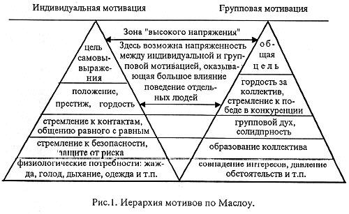 Как показано на рис.1, при вводе в действие мотивационных факторов высших уровней, может появляться напряженность в коллективе, связанная с несовпадением личных и групповых мотивационных факторов.