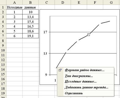 Шаг 3. Установить курсор на построенном графике, сделать щелчок правой кнопкой и в появившемся контекстном меню выполнить команду Добавить линию тренда (см. рис. 2.1).