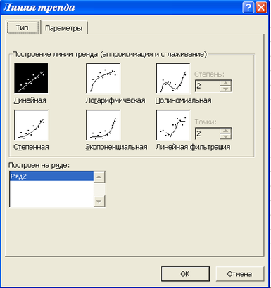 Шаг 4. В появившемся диалоговом окне (см. рис. 2.2) активизировать закладку «Тип» и выбрать нужное уравнение регрессии.