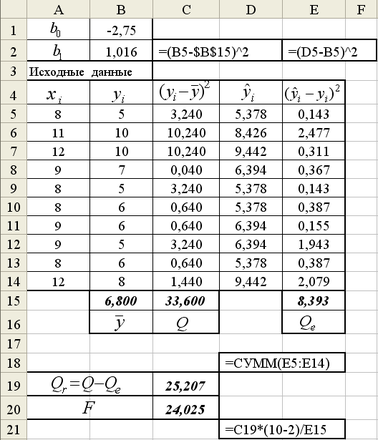 . По формуле (1.15) вычисляем квантиль F0.95; 1; 8 = 5.32. Неравенство (1.14) выполняется, т. е. 24.04 > 5.32 и поэтому уравнение регрессии