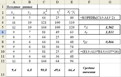 Решение. Фрагмент документа Excel, вычисляющего величины: коэффициента корреляции (формула (1.9));