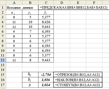 Функции Excel для вычисления коэффициентов парной линейной регрессии
