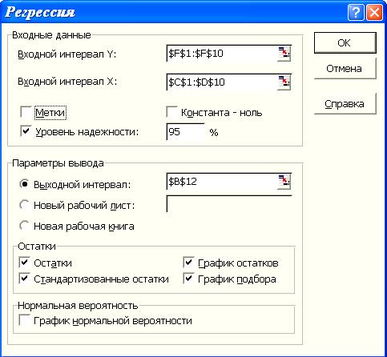 Выходной интервал – при включении активизируется поле, в которое необходимо ввести адрес левой верхней ячейки выходного диапазона, который содержит ячейки с результатами вычислений режима Регрессия.