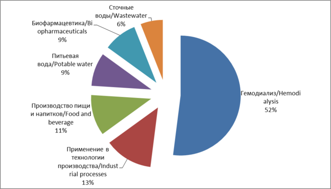 Рассмотрим сферы применения УФ мембран на рынке США (данные исследования BCC). Эти сведения возможно проектировать на российские реалии, если будут разрабатываться прикладные технологии применения мембран. В настоящее время в России всерьез можно говорить только о рынке водоподготовки (получение сверхчистой воды для энергетики и микроэлектроники, питьевой воды, проч.), остальные сегменты характеризуются лишь единичными случаями применения мембранной технологии.
