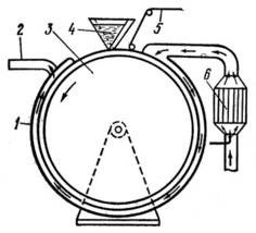 Рис.16. Схема машины барабанного типа для получения мембран методом сухого формования: 1 – кожух, 2 – патрубок для отвода паровоздушной смеси, 3 – барабан,