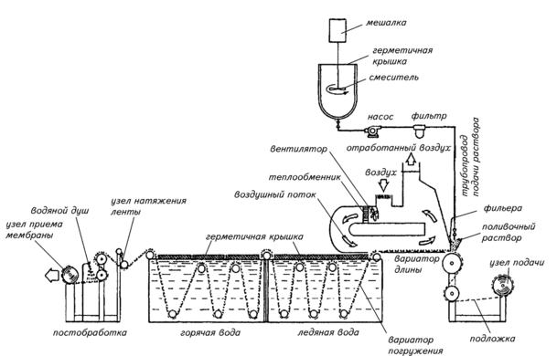 Рис.15. Технология получения полимерной полупроницаемой мембраны по «мокрому» способу.