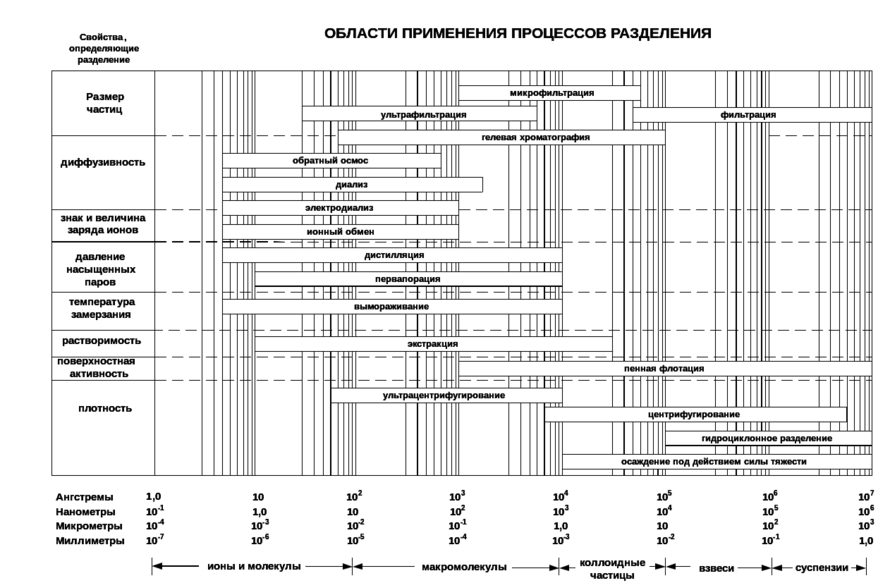 Мембранная технология (МТ) стала достойным конкурентом на рынке процессов разделения. На рис.3 представлена диаграмма применения различных методов разделения смесей, где видно, что мембранные методы охватывают весь диапазон – от ионов до коллоидных частиц. Такие преимущества МТ, как безреагентность, отсутствие отходов, простота оборудования и управления им, более низкие энергозатраты обеспечили ей опережающий рост.