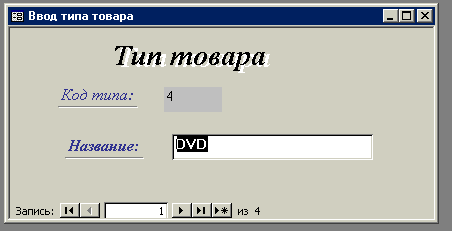 Для добавления нового типа товара, которого ранее не было (например, DVD), необходимо нажать кнопку «Тип», появится окно «Ввод типа товара», показанное на рисунке 2.8, в которое необходимо внести требуемые данные.