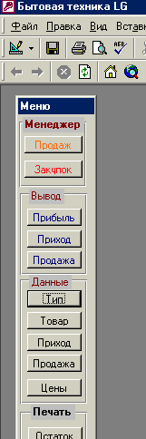 При запуске программы БЫТОВАЯ_ТЕХНИКА появляется окно «Бытовая техника LG», в котором появляется меню с кнопками. В появившемся окне видны кнопки, назначение которых интуитивно понятно из их названия.