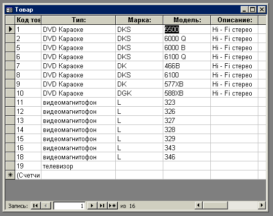 Нажать кнопку «Товар». Исходными данными для программы являются данные о товаре, которые содержатся в таблице или представленные в виде формы. Здесь можно вносить данные о поступивших новых товарах, изменять сведения у имеющихся (например, цену). Для этого нужно использовать окно «Запись» в левом нижнем углу и кнопки