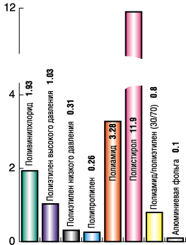 Результаты исследований представлены на диаграмме (значения даны в г/м2 ). Можно заметить, что проницаемость алюминиевой фольги в несколько раз меньше, чем у любого полимерного материала и даже их комбинаций. Следовательно, по проницаемости фольга — вне конкуренции.