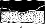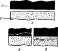 |   Рис. 3.16. Виды разрушений адгезионных соединений: а- адгезионное; б, в- когезионное; г- смешанное:1- адгезив; 2- субстрат.  |  |