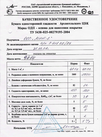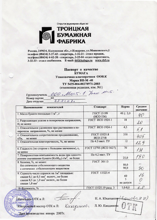 |   Рис. 4.1. Паспорт качества бумаги Архангельского ЦБК  |    Рис. 4.2. Паспорт качества бумаги Троицкой бумажной фабрики  |