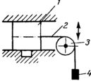 Рис. 3.15. Схема измерения динамической прочности связи единичной нити корда с резиной при многократном сжатии образца: 1— резина; 2—кордная нить; -3 — направляющий ролик; 4 -груз (1-2кГ).