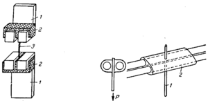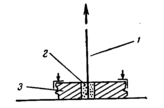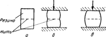 |   Рис. 3.13. Схема измерения адгезии клея к металлам: 1—металлическая нить; 2—слой клея; 3— планка с отверстием.  |    Рис. 3.14. Схема измерения прочности связи резины с кордом при статическом сжатии: а—образец до испытания; б—сжатый образец; в—сжатый образец после отслоения нити.  |