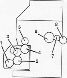 Наносимое количество клея определяется зазором между дозирующим и передающим валами в соответствии с типом соединяемых материалов (рис.3.1.2.1.2). Регулировка зазора между валами производиться с помощью ручных маховичков слева и справа от дозирующего вала. Регулировка скорости вращения передающего вала осуществляется с помощью регулятора, расположенного на панели управления машиной. На регуляторе имеется поворотная шкала для того, чтобы можно было повторить прежнюю установку.