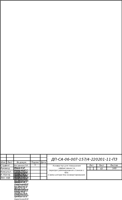 Алгоритм описывает конвертирование исходного текста программы для станков с ЧПУ. В результате программа пересчитывает все исходные координаты из одной системы программирования в другую.