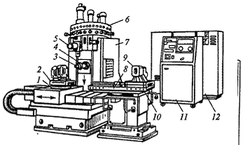 9 – заготовка; 10 – стол-спутник; 11 – система ЧПУ; 12 – шкаф для электрооборудования