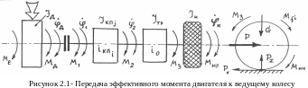 ередача энергии от двигателя внутреннего сгорания (рисунок 2.1 ) через трансмиссию к ведущему колесу происходит с существенными потерями, связанными с сухим и вязким трением при работе элементов трансмиссии, а также с работой сцепления в момент переключения коробки передач. В момент трогания автомобиля, а также при переключении передач, во избежание больших динамических перегрузок в трансмиссии применяют дросселирование эффективного момента с помощью сцепления.