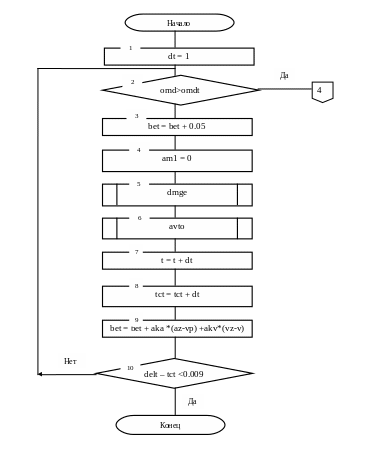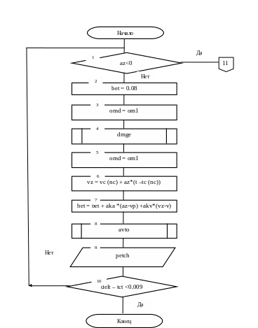 11. Проверка на условие delt–tct<0,009 – если текущее время примерно равно времени цикла движения, расчет данного цикла заканчивается и программа переходит к блоку подготовки алгоритма движения