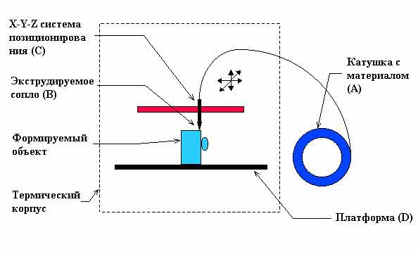 Материал в виде нити, диаметр которой составляет 0,127 см, поступает на катушках (А) длиной 926 м. к экструдируемой головке (В). Сопло находится в нагретом состоянии, температура которого соответствует температуре плавления материала. Материал выдавливается дозами и тут же скрепляется с предыдущем слоем.