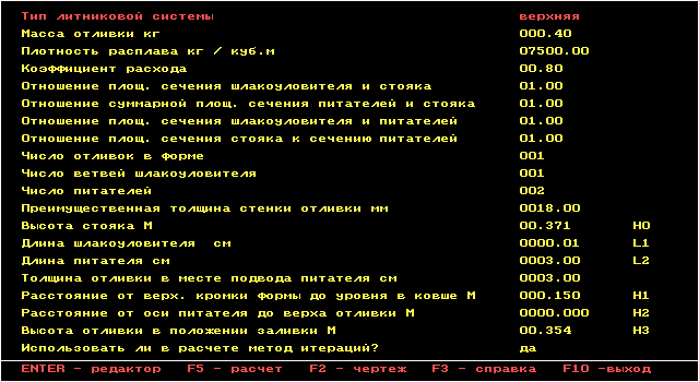 Расчет литниково-питающей системы проводился в программе для расчета литниковых систем, разработанную в институте стали и сплавов.