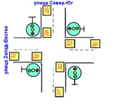 Для работы нечеткого светофора на перекрестке улиц Север-Юг (СЮ) и Запад-Восток (ЗВ) необходимо установить 8 датчиков (рис.1), которые считают проехавшие мимо них машины.