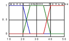 Теперь для каждой переменной надо задать лингвистические термы, соответствующие некоторым диапазонам четких значений. Так, для переменной время зеленого света предлагается использовать три терма (рис.2):