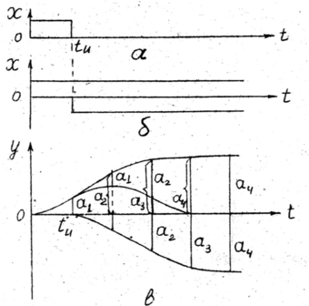 Часто в условиях эксплуатации бывает невозможно снять кривую разгона при продолжительном возмущении достаточно большой величины. В этом случае снимают так называемую импульсную характеристику, а затем по ней находят кривую разгона. Для определения импульсной характеристики на вход объекта подается возмущение в виде прямоугольного импульса достаточно большой амплитуды и записывается изменение регулируемого параметра (рис.1). Реакция объекта на таксе возмущение (кривая yи ) называется импульсной характеристикой объекта. Если исследуемый объект линейный, то на основании принципа суперпозиции импульсную характеристику можно представить , как реакцию объекта на два скачкообразных возмущения, направленных в противоположные стороны и сдвинутых на время