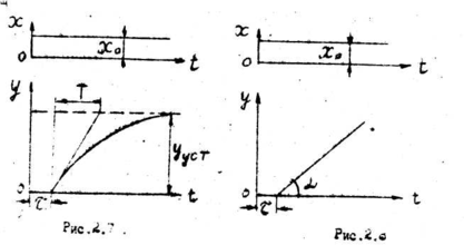 Если исследуемый объект регулирования обладает дифференцирующими свойствами и кривая разгона имеет вид (рис.2.13,а), его передаточная функция может быть приближенно представлена выражением: