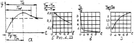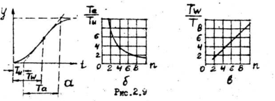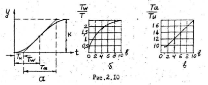 Значения величин Т, n находятся по графикам (рис.2.11, б и 2.11, в). Для этого следует по кривой разгона предварительно найти вспомогательные величины