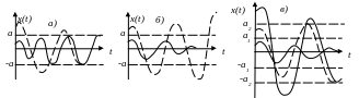 Если процессы в системе имеют вид, указанный на рис. а), то равновесное состояние системы (х=0) неустойчиво. В том случае, когда оба указанных на рис .а) колебания в переменных процессах стремятся к одной и той же амплитуде и частоте, система будет обладать устойчивыми автоколебаниями с амплитудой «а ».