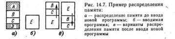 При рассматриваемом способе динамического распределения памяти свободная память может состоять из несвязанных областей (фрагментация памяти) и для ввода нужной программы может понадобиться сдвиг содержимого памяти. На рис. 14.7, а показано распределение памяти между программами А, В, С, D, из которых две (А и D) являются в данный момент наименее активными и следовательно, могут рассматриваться как кандидаты на удаление во внешнюю память. Если вновь вводимая программа Е (рис. 14.7, б) больше любой из программ А и D, то для ее размещения в памяти необходимо, как показано на рис. 14.7, а, сдвигать программы В и С. Это перемещение связано с потерей времени. Более того, в ряде систем подобное перемещение требует выполнения заново операции редактирования связей в программе и новой загрузки программы.