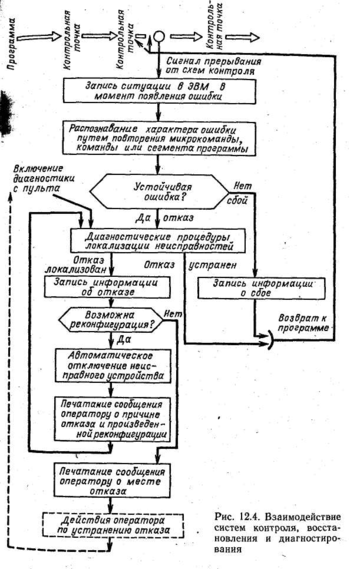 Общая логика взаимодействия систем автоматического контроля, восстановления и диагностирования показана н рис. 12.4. Первой выполняется процедура обработки сигнала прерывания. от системы контроля, начинающаяся записью состояний регистров процессора и старого слова состояния программы (ССП) в соответствующие ячейки памяти и выборкой нового ССП системы восстановления. Далее производится запись в специальные регистры или ячейки памяти ситуации в ЭВМ в момент обнаружения ошибки (записывается состояние запоминающих элементов и шин передачи данных неисправного устройства) '.