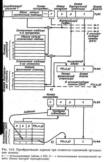Преобразование адресов всегда начинается с просмотра ассоциативной памяти (ББП), и если оказывается, что в одной из ее строк (ассоциативном регистре) хранится информация о странице, к которой должно произойти обращение, то из этой строки непосредственно выбирается номер физической страницы и дополнительные обращения к ОП (к сегментной и страничной таблицам) не производятся (рис. 14.9,6).