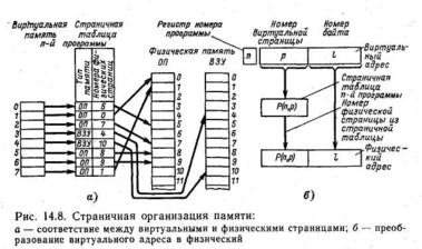 Страничные таблицы программ хранятся в ОП, и обращение к нужной строке активной страничной таблицы в ОП происходит по адресу, который определяется номером активной программы и номером виртуальной страницы (рис. 14.8).