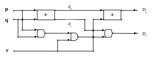 Полный сумматор складывает три одноразрядных двоичных числа. Следовательно, он может сложить два двоичных числа с тем числом, которое «переносится». Обозначим два складываемых числа через p и q, а бит переноса – r. На выходе будем иметь два бита суммы – младший D0 и старший –D1, который будет являться битом переноса для следующего разряда. Имеем следующие таблицы истинности: