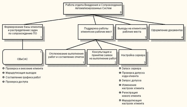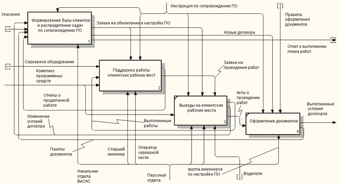 На Приложении 1 представлена древовидная структура организации работ по сопровождению клиент-серверной системы. Рассмотрим более подробную схему на примере диаграммы декомпозиции IDEF0 (Приложение 2).