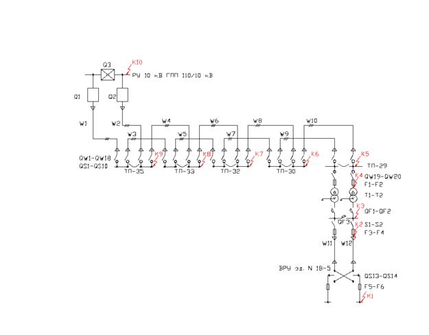 Рассмотрим электрическую цепь РУ 10 кВ ГПП 110/10 кВ — ТП-35 — ТП-33 — ТП-32 — -ТП-30 — ТП-29- ввод в здание №18-5 (продовольственный магазин).